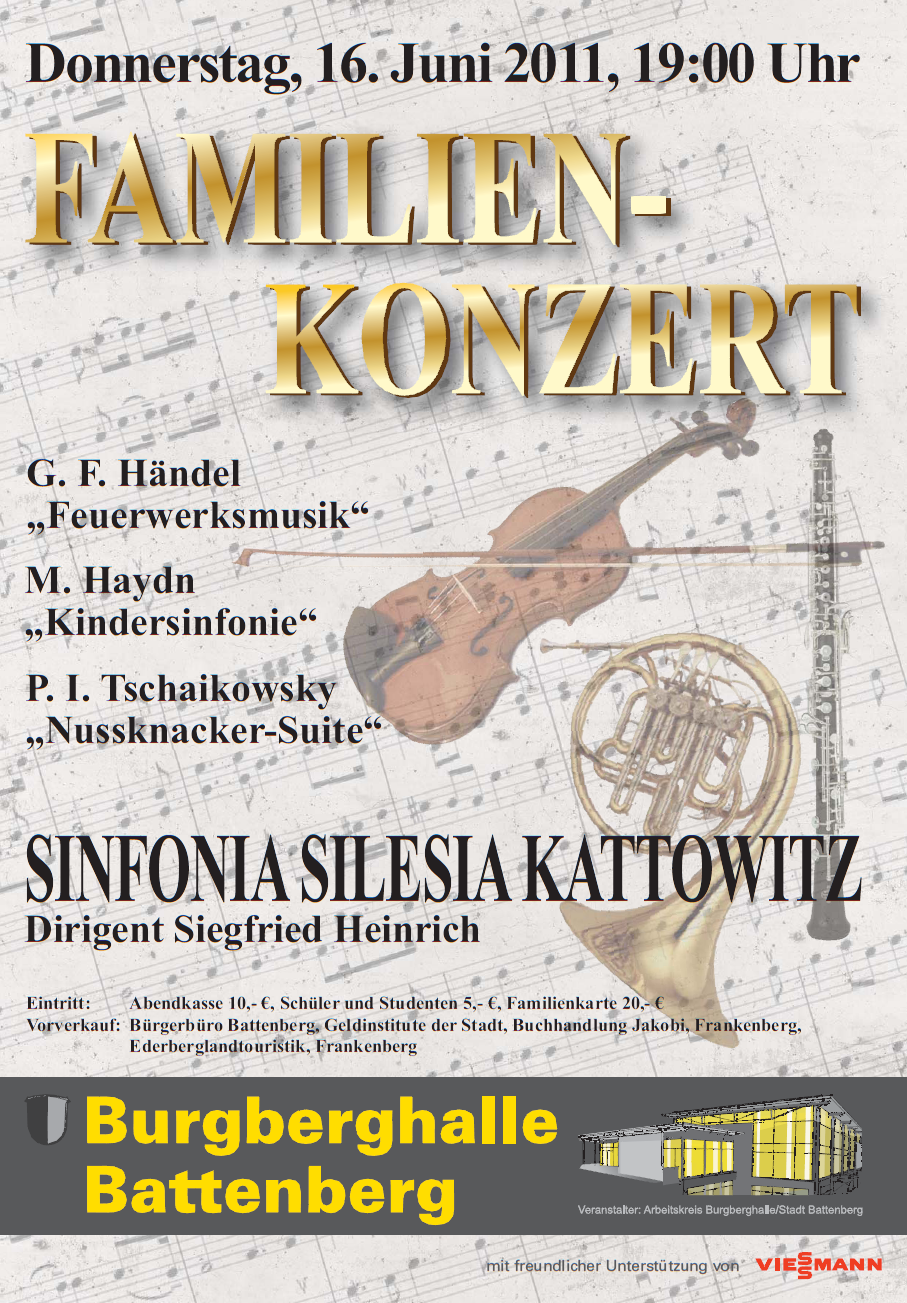 Am 16.06.2011 findet in Organisation des Arbeitskreises Burgberghalle ein besonderes Konzert-Ereignis in der Battenberger Burgberghalle statt. Die Sinfonia Silesia Kattowice (das polnische Nationalorchester) gastiert in diesem Jahr auch bei den Hersfelder Festspielen und ist dort eines der Highlights der diesjährigen Festspiele.