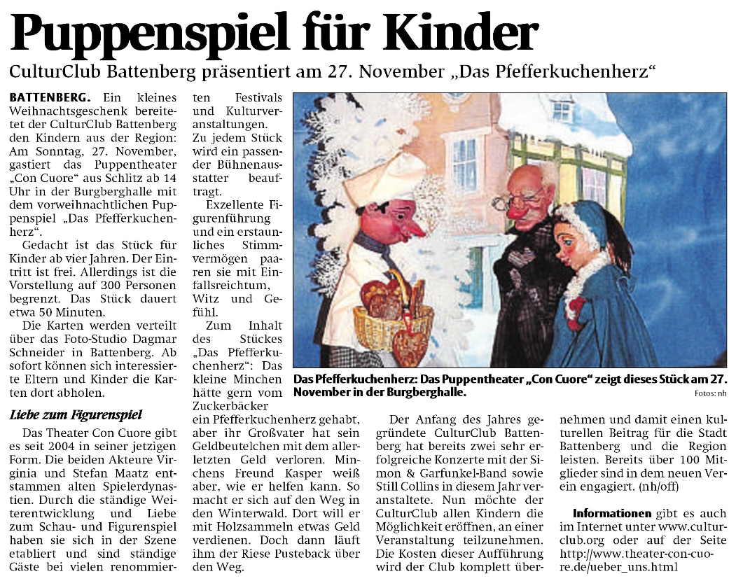 Das Theater con Cuore gibt es seit 2004 in seiner jetzigen Form.Hier vereinen sich verschiedene Stilrichtungen des Figuren- und Schauspieltheaters und schenken jeder Inszenierung etwas unvergleichbares. Virginia und Stefan entstammen beide alten Spielerdynastien. Durch die ständige Weiterentwicklung und Liebe zum Schau- und Figurenspiel haben sie sich schon nach kurzer Zeit in der Szene etabliert und sind ständige Gäste bei vielen renommierten Festivals und Kulturveranstaltungen nicht nur im Bundesgebiet. Neuinszenierungen werden teils mit gefragten Theaterregisseuren teils in Eigenregie realisiert. Zu jedem Stück wird zudem ein passender Bühnenausstatter beauftragt. Virginia und Stefan zeichnen sich durch ein Höchstmaß an Professionalität, Wandlungsfähigkeit und Individualität aus. Exzellente Figurenführung und ein erstaunliches Stimmvermögen paaren sie mit Einfallsreichtum, Witz und Gefühl. Und mit Herz. Denn ohne Herz lebt nichts. Auch nicht im Theater.